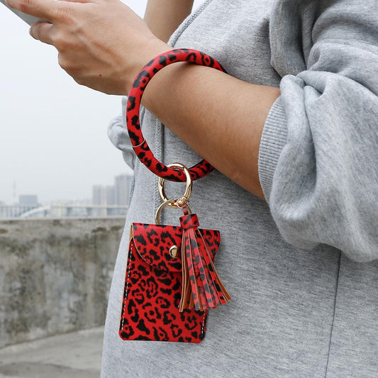Bracelet Keychain Leopard PU Leather Fringe Card Wrist Wallet